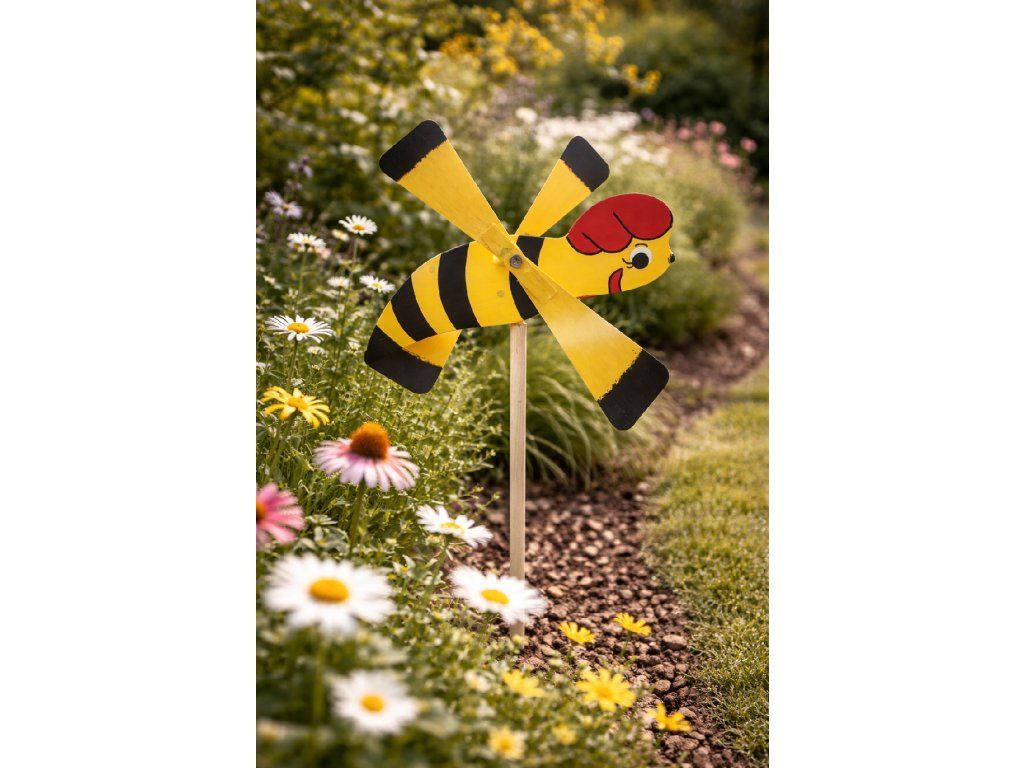 Dodaj do swojego ogrodu lub na balkon odrobinę naturalnej radości dzięki drewnianemu wiatraczkowi w kształcie pszczółki. Wykonany z wysokiej jakości drewna i ręcznie malowany w delikatnych żółto-czarnych barwach, przypominających prawdziwą pszczołę, pięknie obraca się na wietrze, ożywiając każdą przestrzeń na świeżym powietrzu.