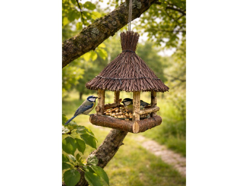 Ten naturalny karmnik zapewnia ptakom stabilne i bezpieczne miejsce do dokarmiania w chłodne dni. Dzięki konstrukcji z otwartym dostępem i ochronnym daszkiem chroni pokarm przed deszczem, śniegiem i wiatrem, pomagając utrzymać go suchym i świeżym.