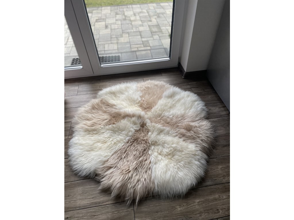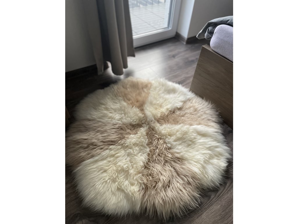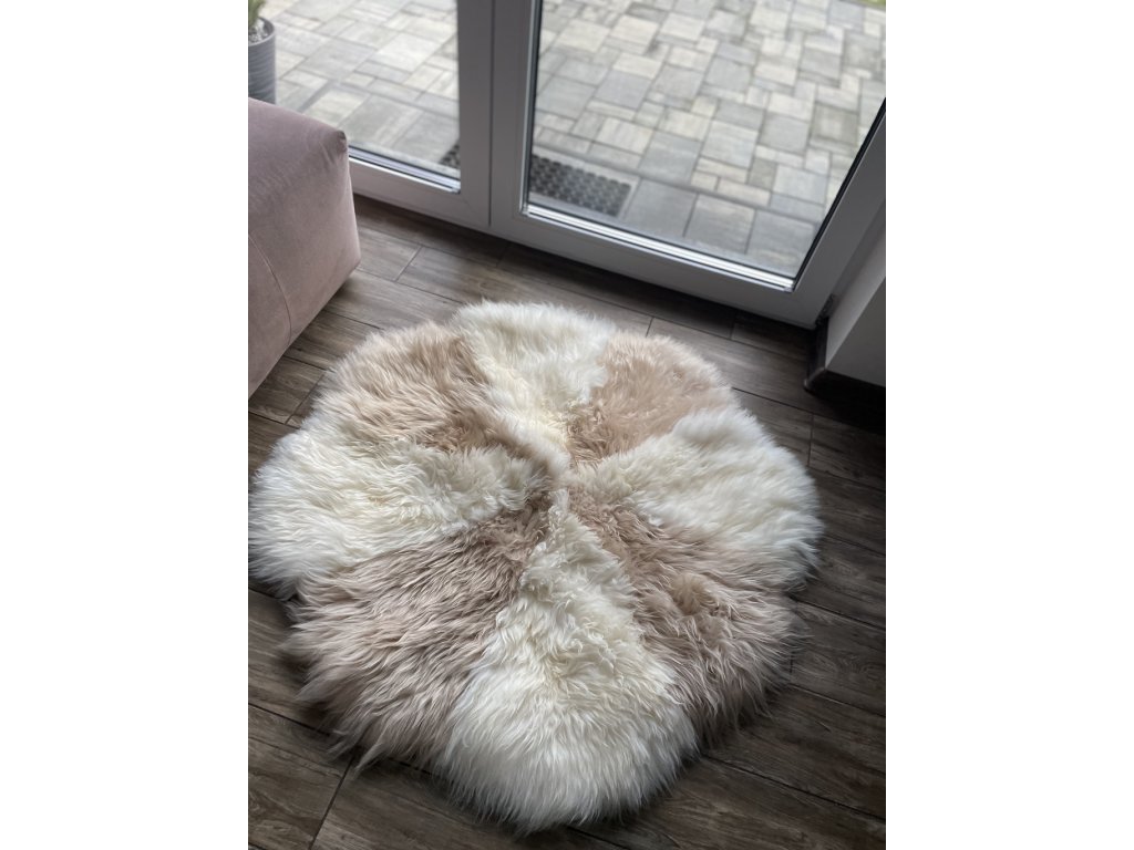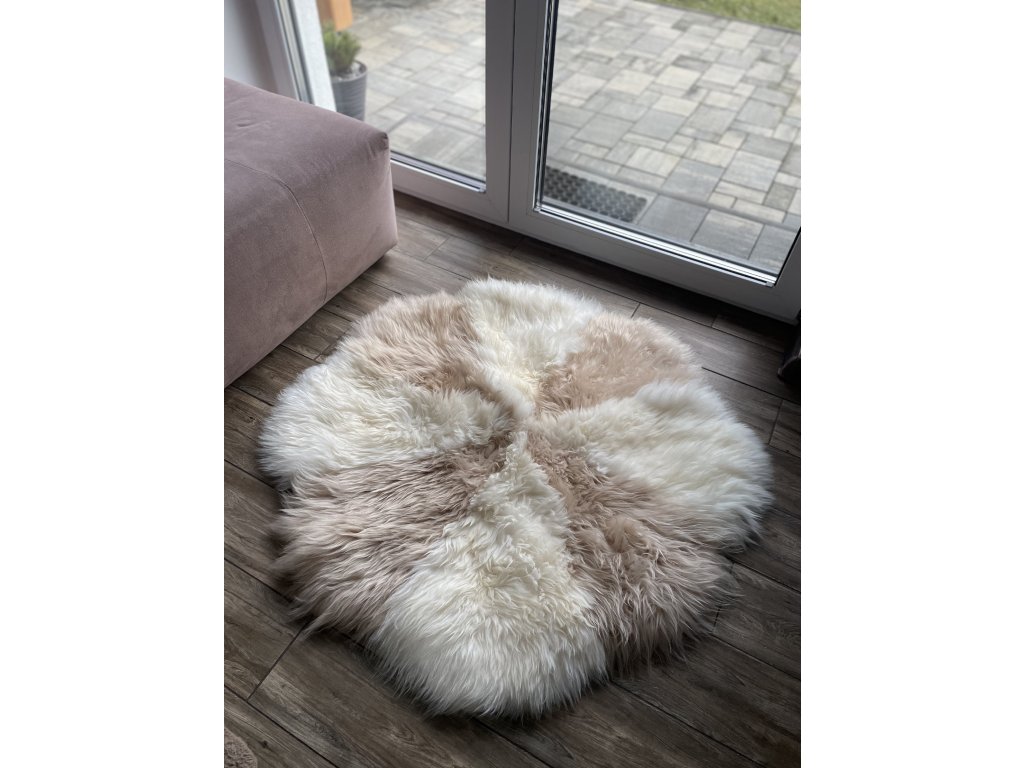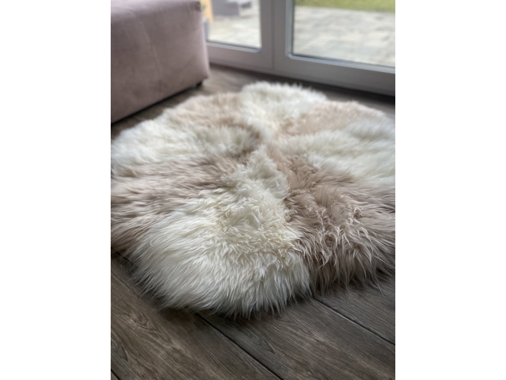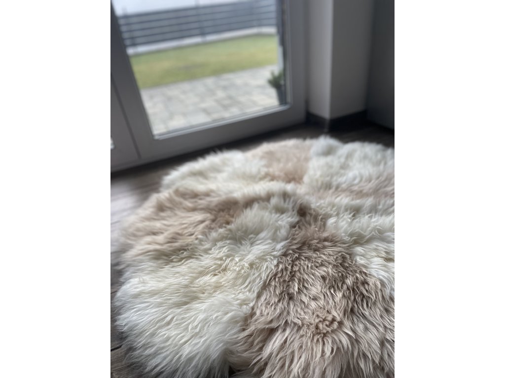 Wnieś wyjątkowy element natury do swojego domu z tym pięknym okrągłym dywanem wykonanym w 100% ze skóry owczej. Połączenie beżowych i białych odcieni nadaje wnętrzu naturalny, harmonijny wygląd i łatwo komponuje się z różnymi stylami wyposażenia – od rustykalnego, przez skandynawski, po nowoczesny.
