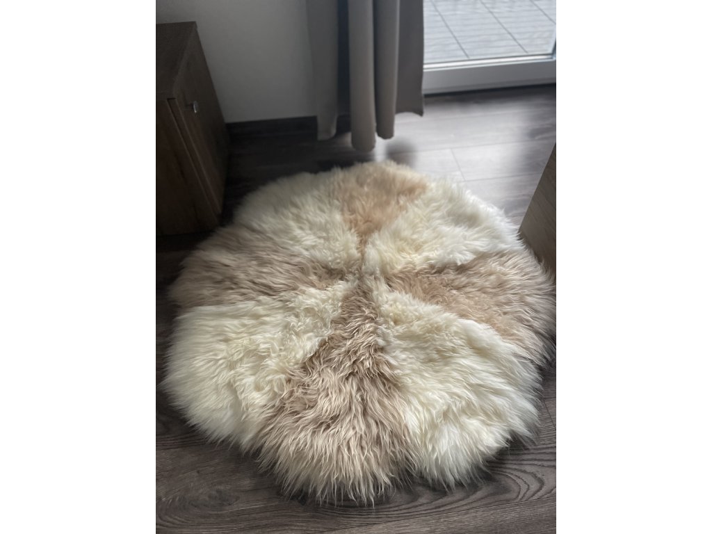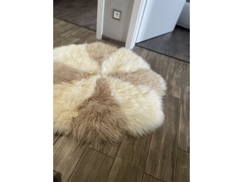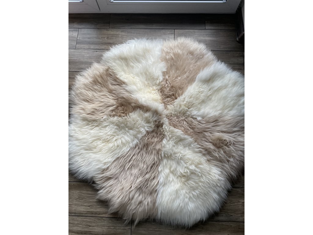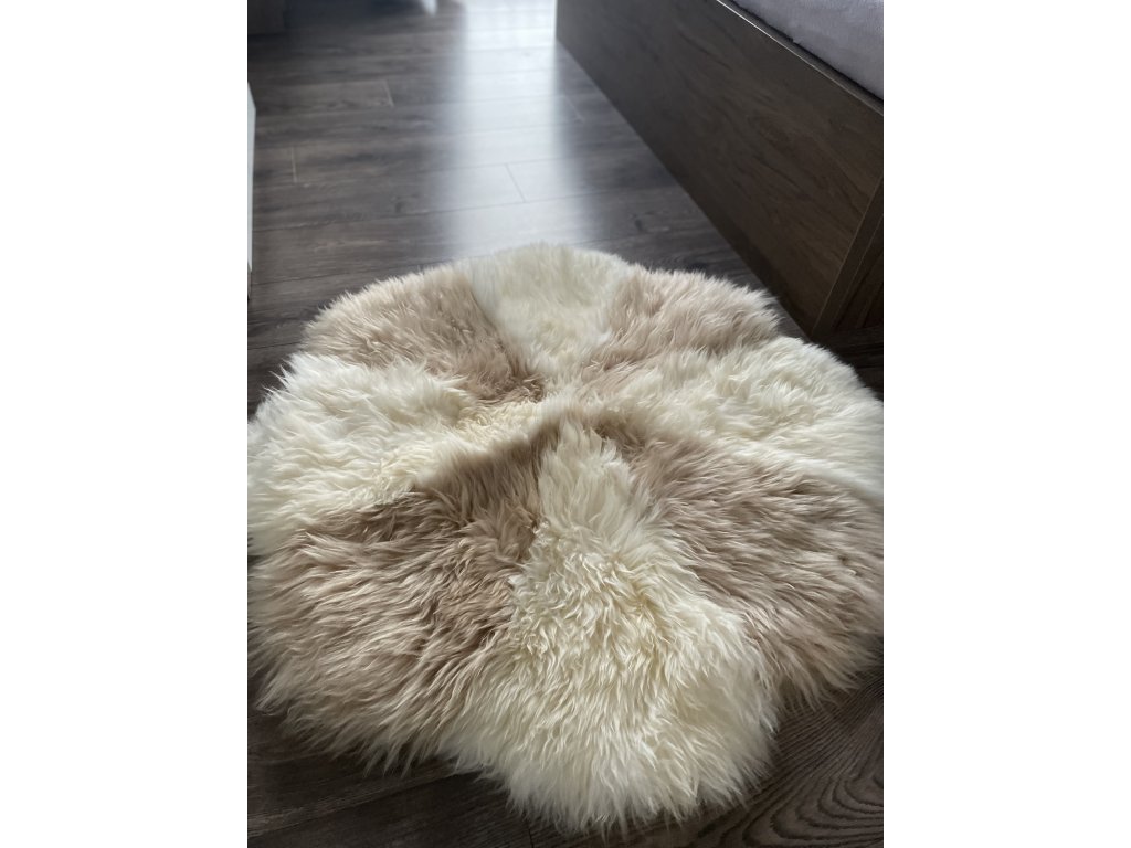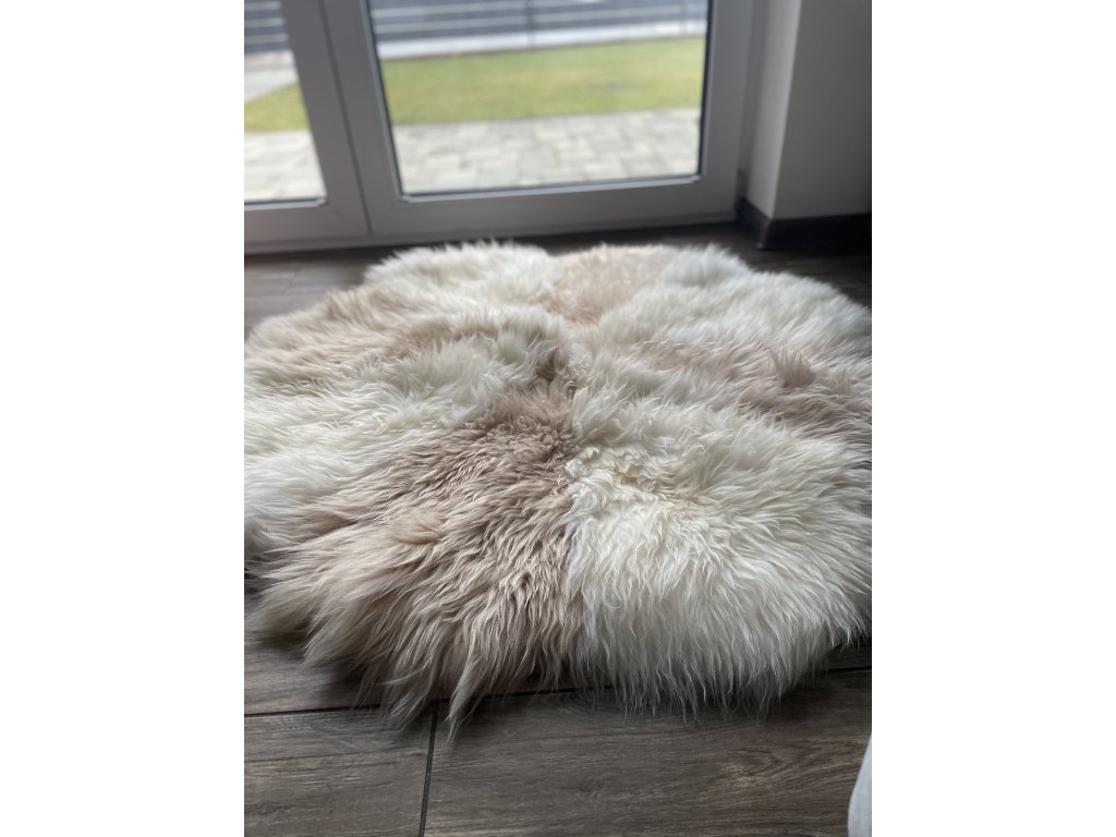Wnieś wyjątkowy element natury do swojego domu z tym pięknym okrągłym dywanem wykonanym w 100% ze skóry owczej. Połączenie beżowych i białych odcieni nadaje wnętrzu naturalny, harmonijny wygląd i łatwo komponuje się z różnymi stylami wyposażenia – od rustykalnego, przez skandynawski, po nowoczesny.