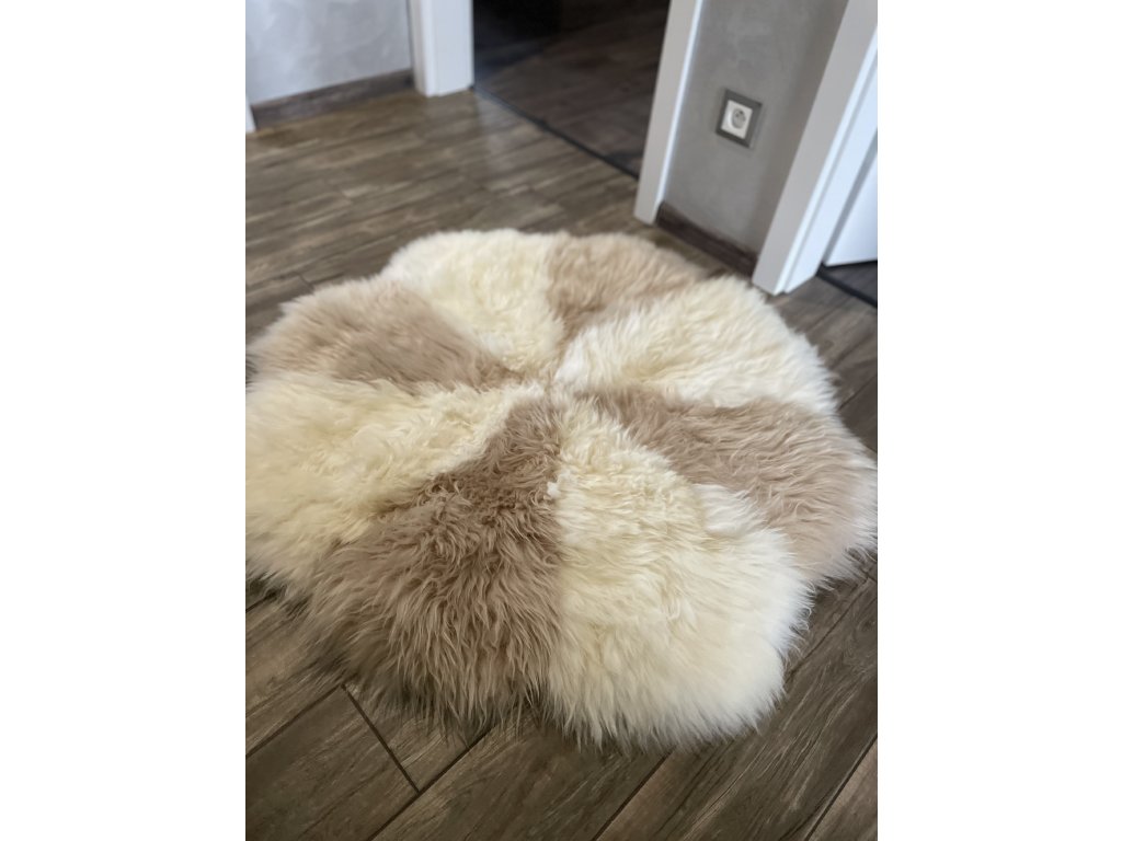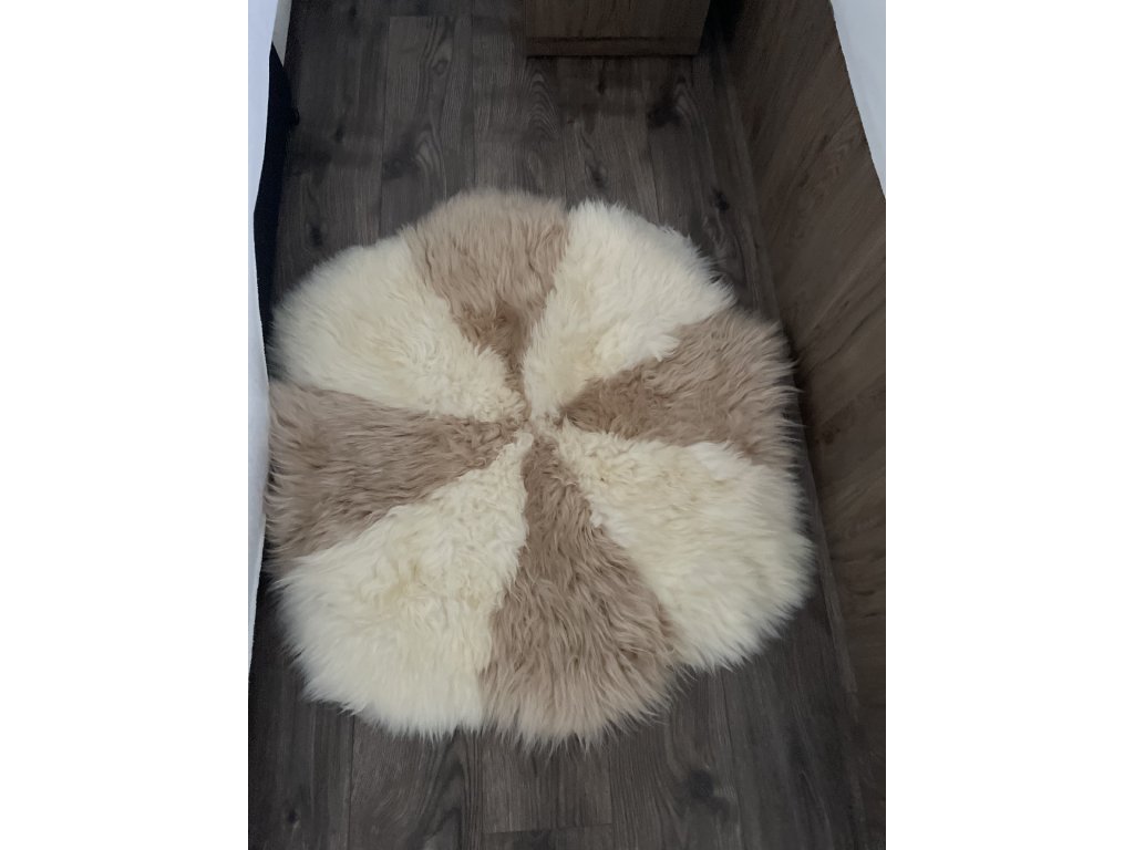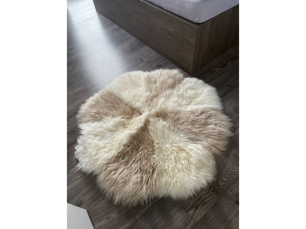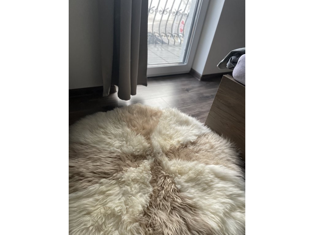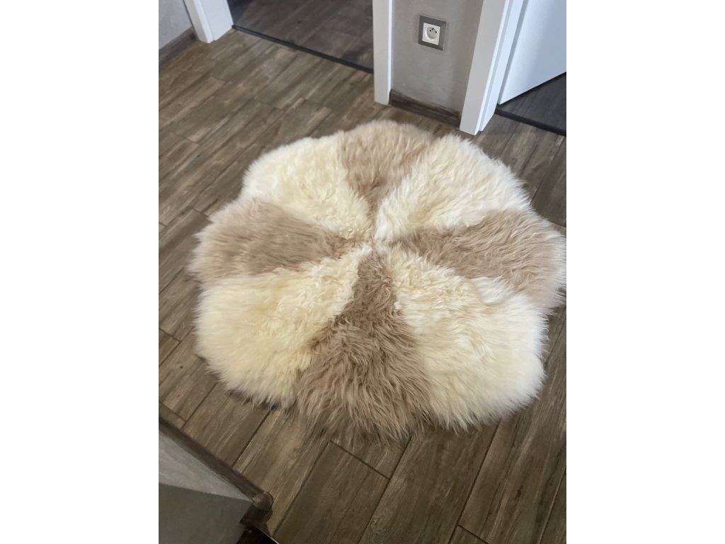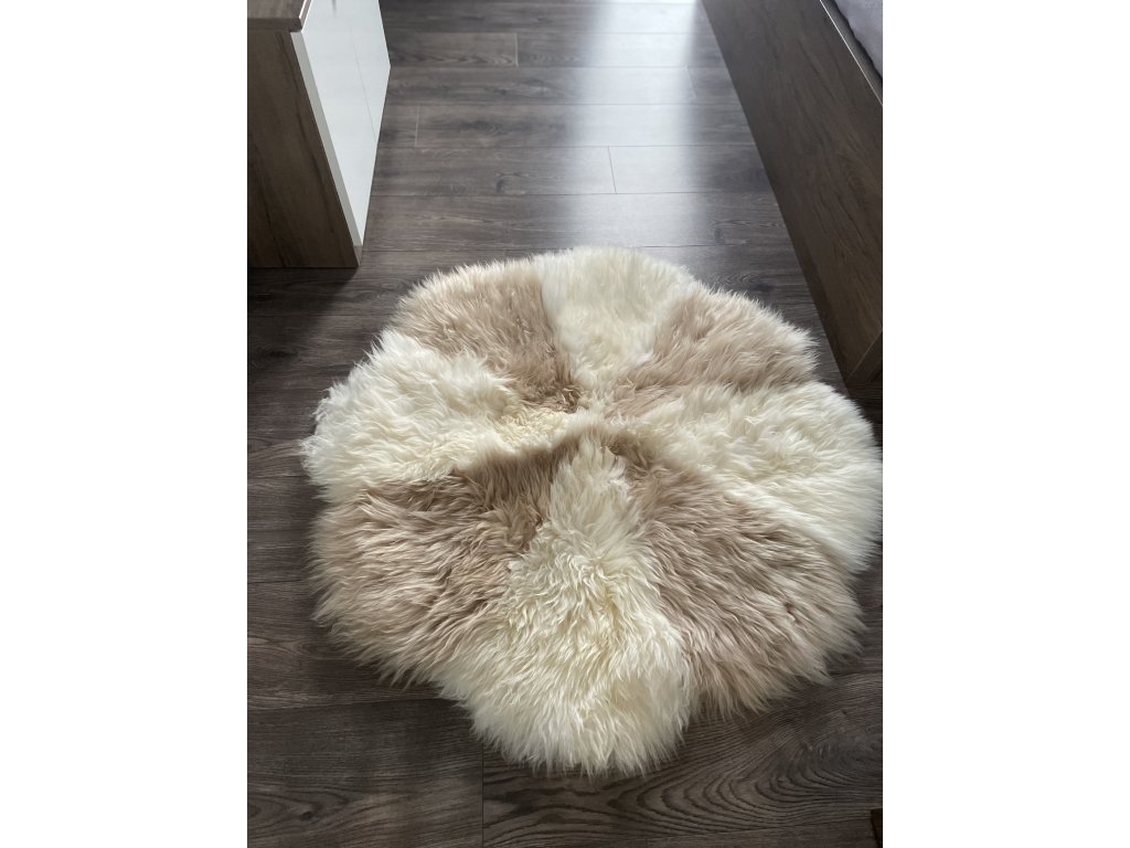 Wnieś wyjątkowy element natury do swojego domu z tym pięknym okrągłym dywanem wykonanym w 100% ze skóry owczej. Połączenie beżowych i białych odcieni nadaje wnętrzu naturalny, harmonijny wygląd i łatwo komponuje się z różnymi stylami wyposażenia – od rustykalnego, przez skandynawski, po nowoczesny.