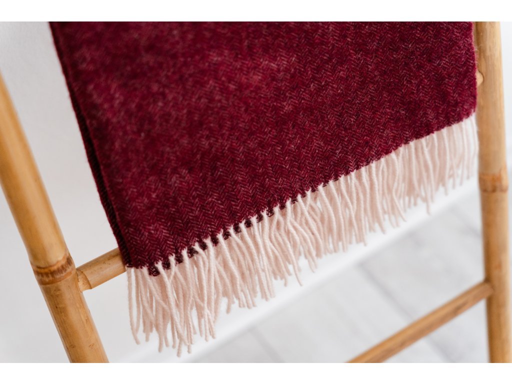 Bordowy kolor i dekoracyjne frędzle nadają kocowi nowoczesny i ponadczasowy wygląd.