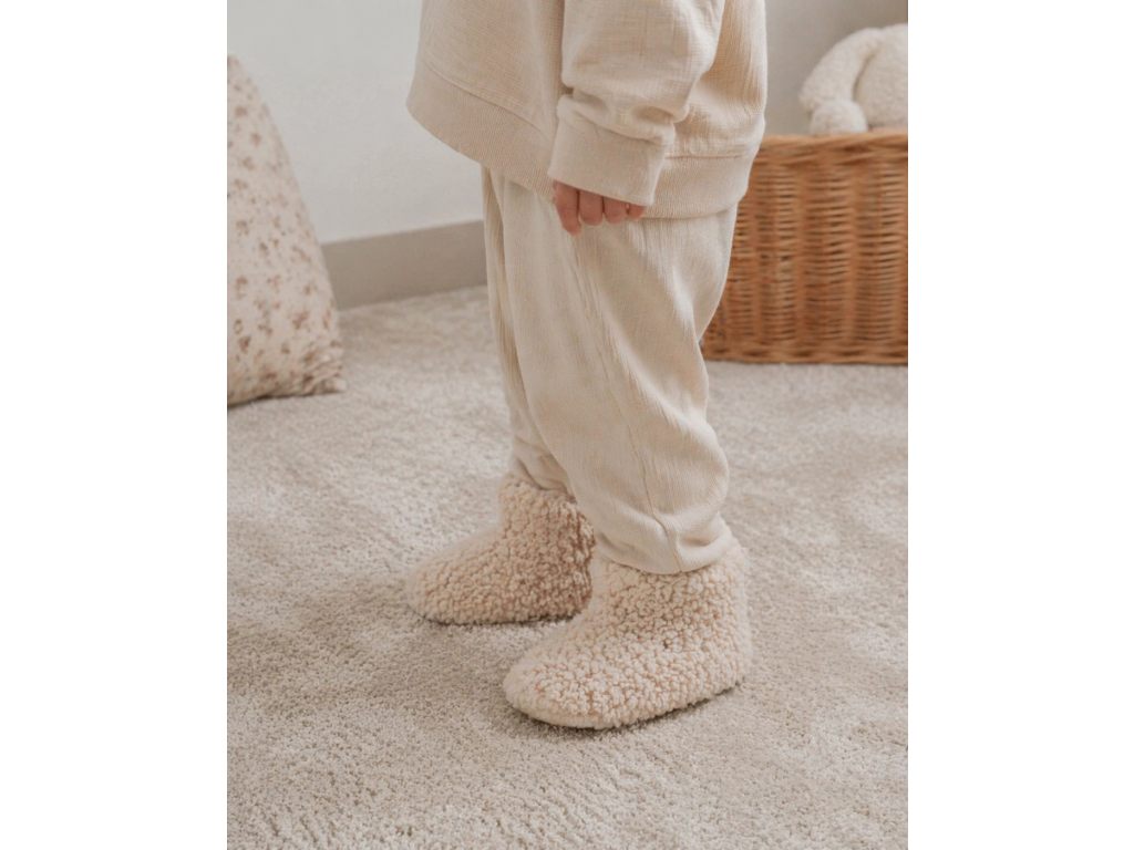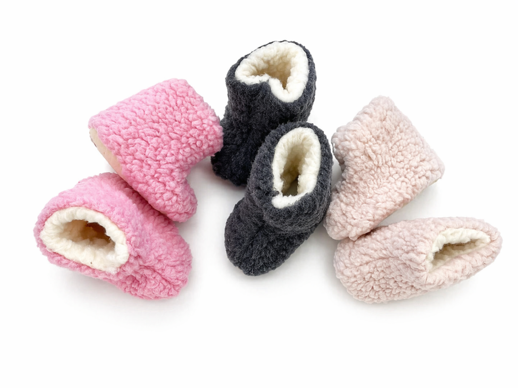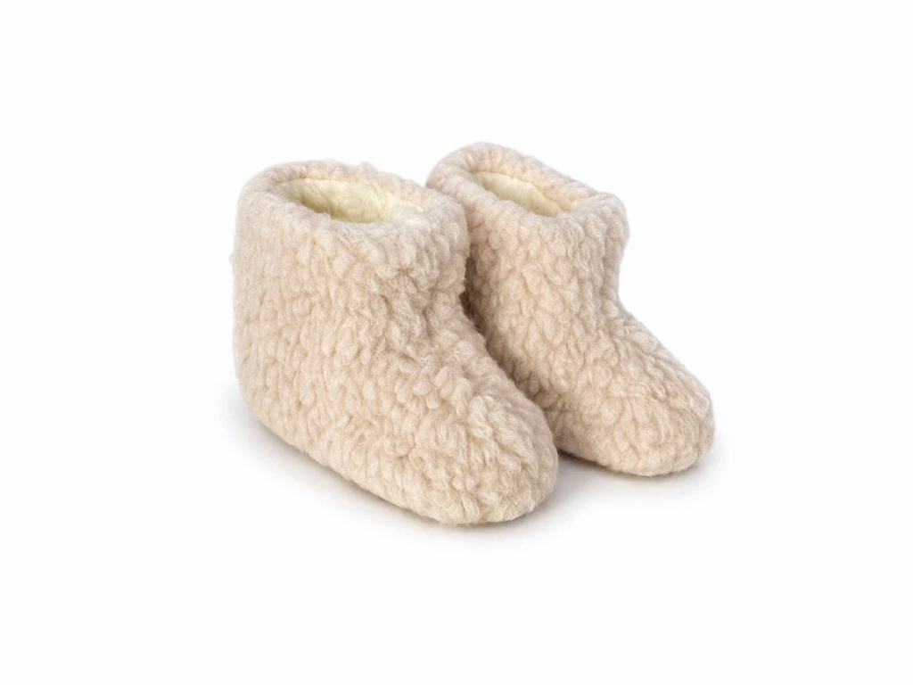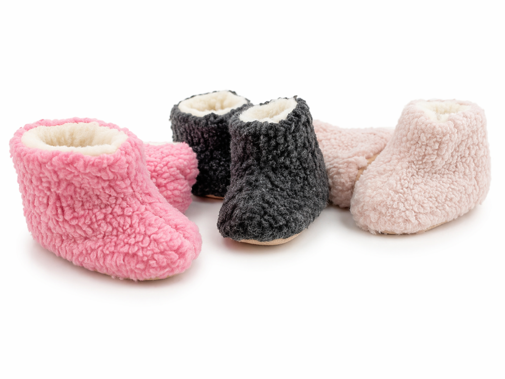 Kapcie posiadają antypoślizgową podeszwę, która zapewnia bezpieczne poruszanie się po różnych powierzchniach – zarówno w domu, jak i na placu zabaw. Miękka wełna owcza delikatnie otula dziecięcą stopę, gwarantując komfort nawet podczas dłuższego noszenia.